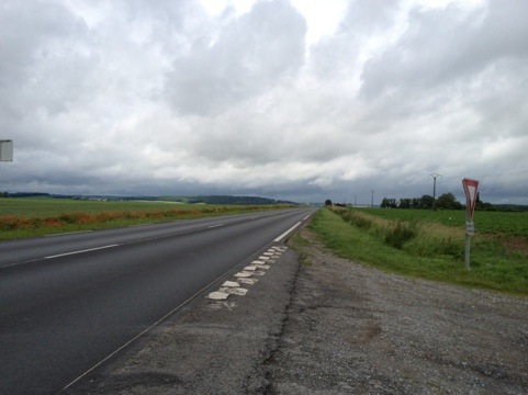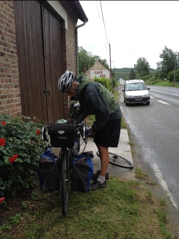 We started off toward Saint Quentin at about 9, and the rain was fairly steady. It was a busy road too, so endless cars sloshing past, and the occasional truck simultaneously spraying us with dirty water and blowing us across the road. Then George got a puncture, his fourth for the trip and second since I’ve been riding with him. The puncture gods have left me alone so far.