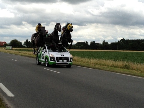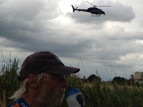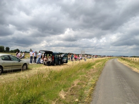 The next morning we made some good progress on the Tour course, getting to about the 60km mark before the police kicked us off. It was about an hour wait before the caravan of sponsor vehicles arrived, throwing trinkets out to people lining the course. Then another 45 minutes until the race arrived, announced by a phalanx of helicopters. Five of them!