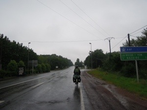 We left the grave factory just before noon, hoping to get to the next village about 10km down the road before the Intermarche closed. This is Sunday in France where most shops are closed all day and only a few supermarkets open in the morning. We rode through half an hour of pissing down rain to make it to the Intermarche before 1230. Unfortunately they shut at 12 so we were too late anyway. Even the dumpster was off limits to George, being locked behind a barrier to keep out the likes of him.